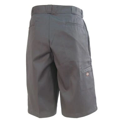 These charcoal grey shorts are made from 8.5 ounce, 65% polyester and 35% cotton twill with a Scotchgard stain release finish. They have a 13 inch inseam, and lockstitched hems. They have a flat front, non-roll waistband, and a no-iron permanent crease. These men’s shorts are also wrinkle resistant so you will stay looking neat and professional the entire day. They feature the cell phone pocket and Dickies logo on the left front leg.